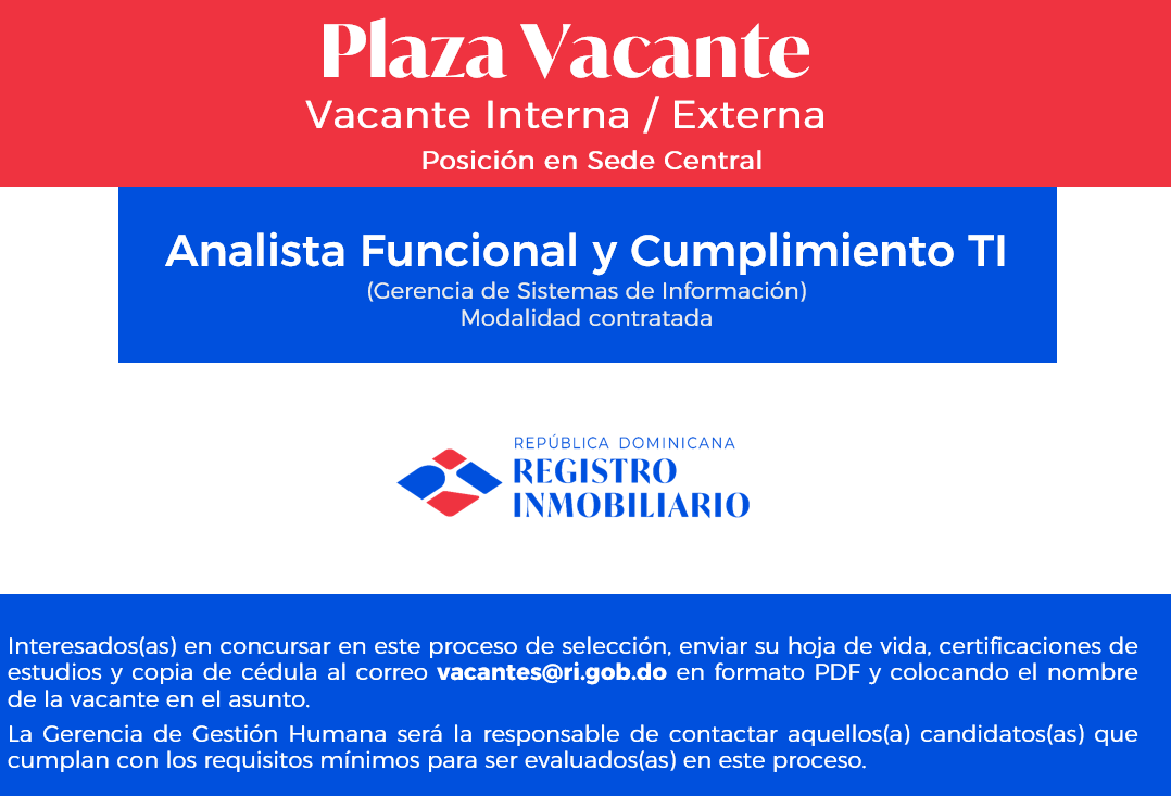 Interesados(as) en concursar en este proceso de selección, enviar su hoja de vida, certificaciones de estudios y copia de cédula al correo vacantes@ri.gob.do en formato PDF y colocando el nombre de la vacante en el asunto, hasta el martes 06 de febrero 2024.